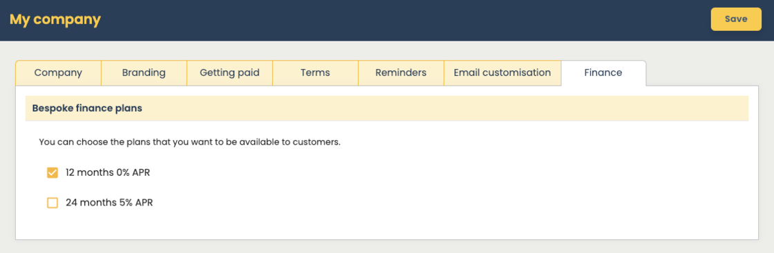 All updatesChoose which bespoke finance plans to enable on your accountNew1 July 2021·Payaca Team← OlderFixed mobile "Related quote" and "Related invoice" buttons!Newer →Add percentages with 2 decimal places for markups, discounts and deposits