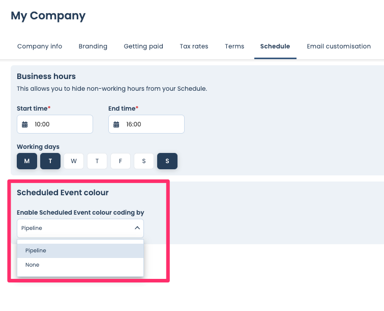 We've added this new setting to the Schedule setting in your company settings so you can quickly identify your events in your Schedule by the colour of the Deal Pipeline that the event is attached to