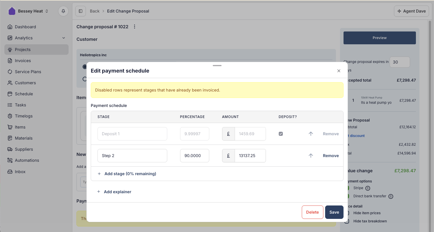 Now, you can attach a payment schedule directly to a Change Proposal. Your Customer sees the updated schedule alongside the proposed changes in the Client Portal and downloadable PDF, and when they accept the Change Proposal the new schedule is applied to the Project automatically.