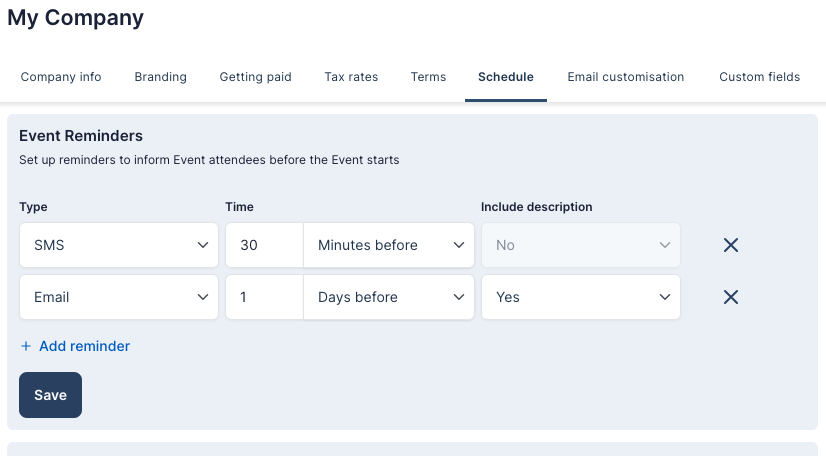 Go to the 'My Company' page and visit the 'Schedule' tab to set up Event reminders for your account.