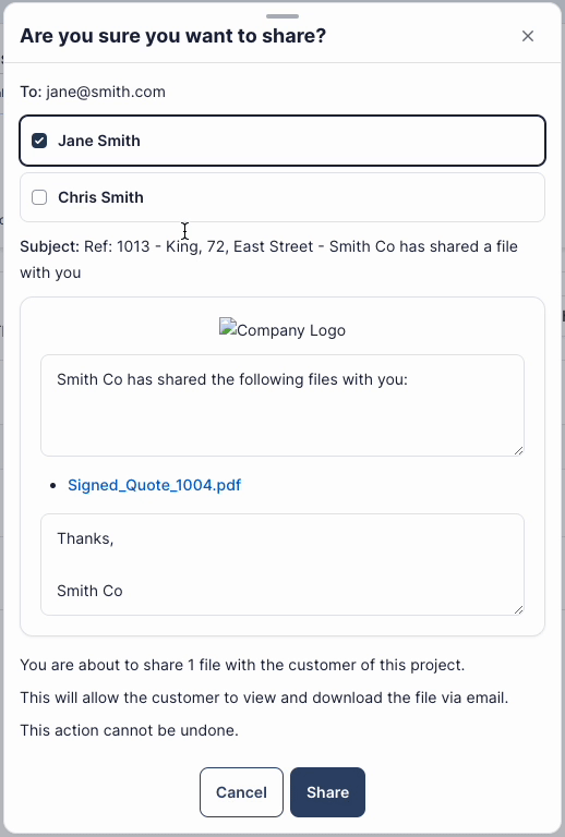 Owen EvansYou can now share files with multiple contacts at the same time! An individual email will be sent to each.