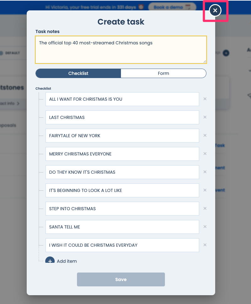 Did you ever create a really long task list of the top 40 Christmas songs and then accidentally click somewhere else on the screen and all your Christmas songs were lost… We've fixed that for you, you now have to explicitly click the close button on the modal to close it. This is also fixed for all other modals where you will be entering a lot of information.