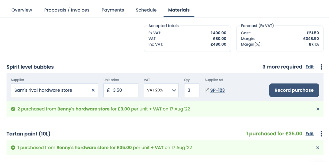 Linking your items to materials enables you to import a list of materials needed for a job directly from the quote.