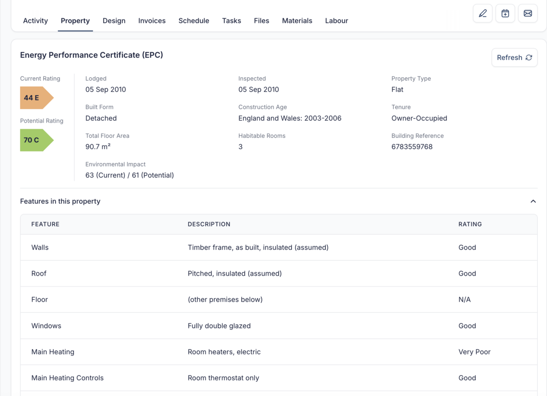 Now, when you add a new site address, Payaca automatically checks for the latest Energy Performance Certificate (EPC) for that property (England and Wales). All the relevant data is then loaded directly into a new 'Property' tab for that job, giving you key insights without any manual entry.