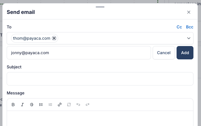 Dave TimmsIf you use our Gmail integration, you can send emails to customers directly from a Payaca Project page. Previously, this was limited to email addresses which you have saved for the Customer. Now, you can select the "Add other…" option and put in a custom email address. This lets you keep conversations with other parties like suppliers and subcontractors visible in the Payaca project.