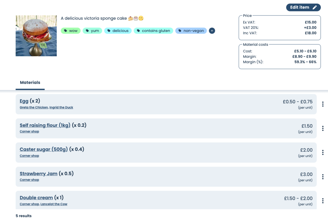 You are now able to record all the materials you need to deliver a particular item, and see calculated cost/margin ranges.