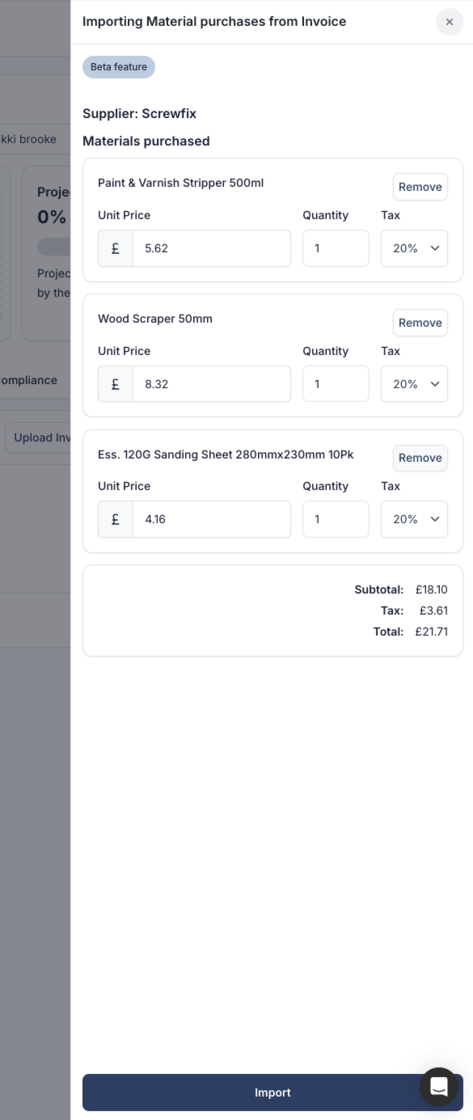 We have added a "Remove" button to lines on our AI Invoice upload so you can efficiently keep your Materials lists accurate.